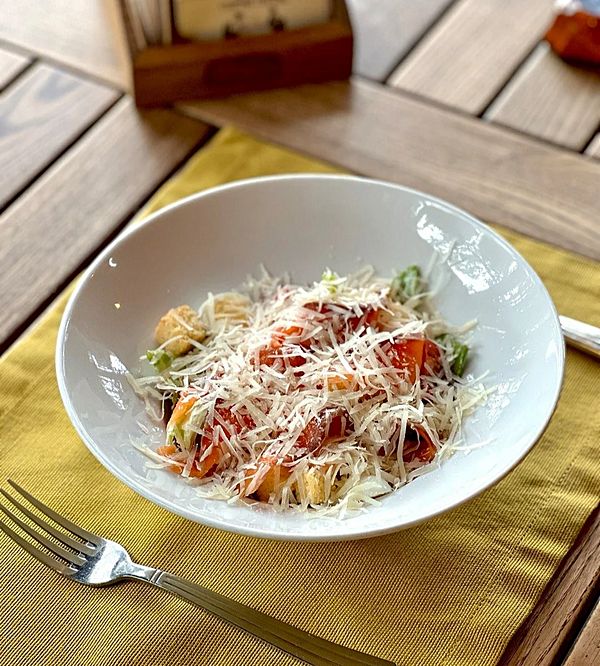 Салат айсберг, ромейн, перепелиное яйцо, курица-гриль, черри, сухарики, сыр Пармезан, соус Цезарь