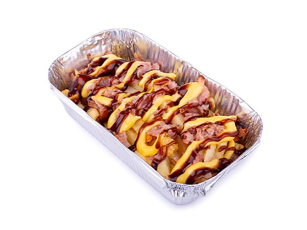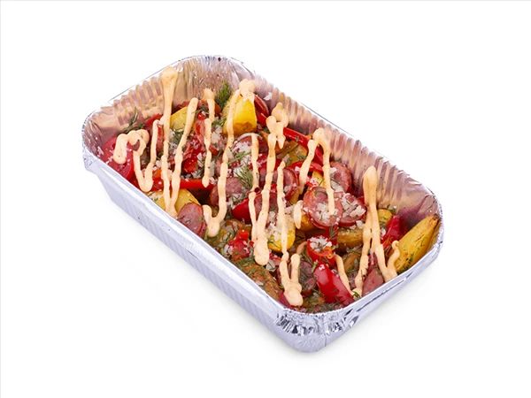 Картофель фри запекается с колбасками в печи и поливается соусом "Сырный" и соусом "Барбекю"